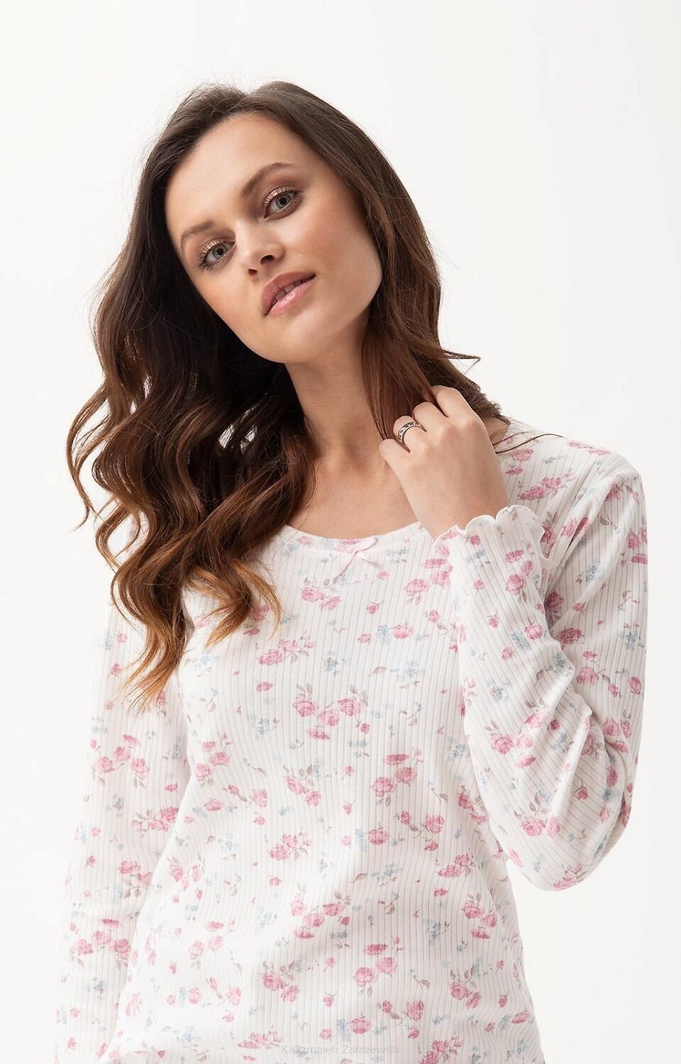 Piżama damska- bawełna delikatnie prążkowana- w kwiatowy nadruk- koszulka z długim rękawem- rękawy zakończone falbanką (mereżką)- dekolt okrągły, zdobiony doszytą kokardką- długie proste spodnie prečítať celé