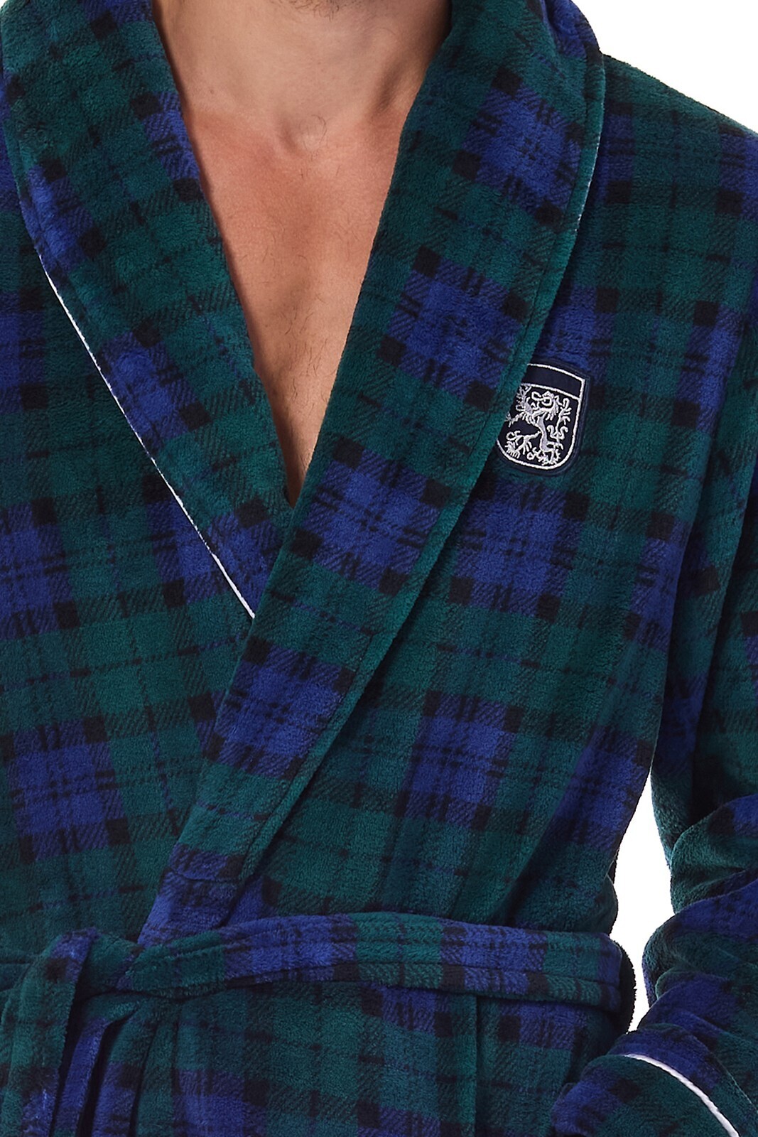 Szlafrok męski- miła i miękka dzianina w kratkę- szalowy kołnierz- na piersi mała aplikacja- wiązany w pasie- mankiety i kołnierz obszyte jednolitą lamówką- po bokach wygodne kieszenie prečítať celé