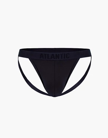 Zmysłowe slipy jockstrap - charakteryzują się niezwykle skąpym krojem- bardzo niska talia zaznaczona jest miękką i niecisnącą ciała gumą, ozdobioną logo Atlantic, która stanowi jednocześnie boki bielizny- z tyłu majtki w całości odkrywają pupę, linia pośladków zaznaczona jest gumowymi paskami-...