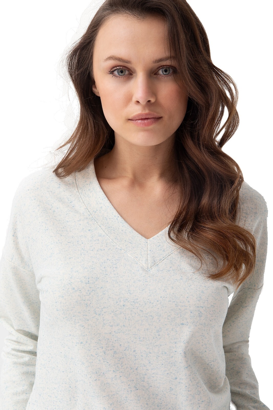 Piżama damska typu homewear- wykonana z grubszej, melanżowej bawełny- dekolt w kształcie litery "V"- długie spodnie z kieszeniami- pas ozdobiony troczkiem do wiązania kokardki- rękawy i nogawki zakończone szerszym mankietem- idealny komplet jako piżama i domowy strój prečítať celé