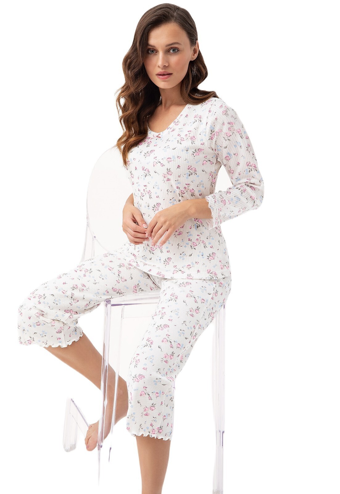 Piżama damska- bawełna delikatnie prążkowana- w kwiatowy nadruk- koszulka z długim rękawem- rękawy zakończone falbanką (mereżką)- dekolt okrągły, zdobiony doszytą kokardką- spodnie typu rybaczki prečítať celé