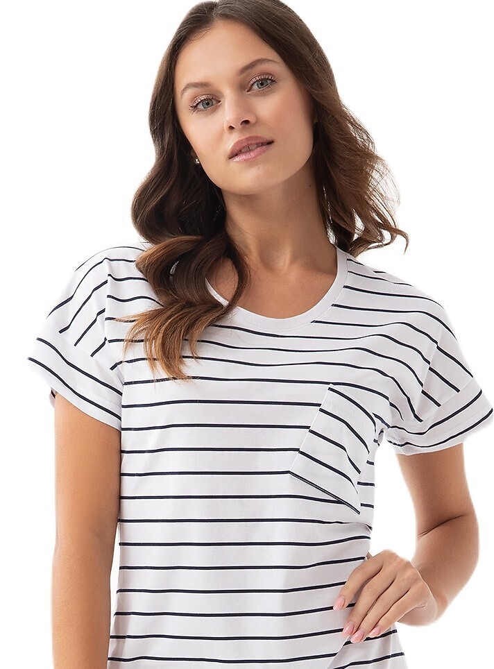 Bawełniana koszula damska- print w paski- półokrągły dekolt- na wysokości klatki piersiowej kieszeń- krótki rękaw- długość przed kolana prečítať celé