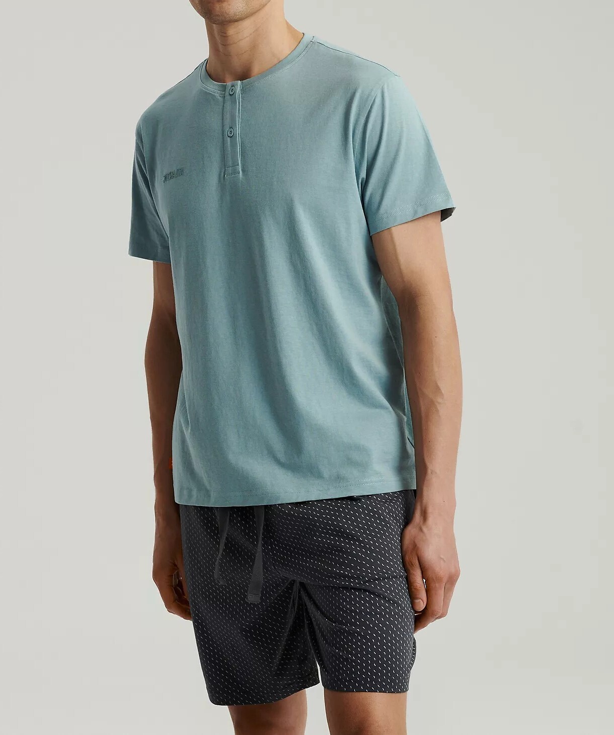Letnia piżama męska- miękka dzianina z bawełny- koszulka z krótkim rękawem- okrągły dekolt z rozcięciem i dwoma guzikami- luźne, krótkie spodenki ozdobione drobnym wzorem- w pasie guma obszyta dzianiną i wiązany troczek do regulacji obwodu pasa- na biodrach wygodne kieszenie prečítať celé