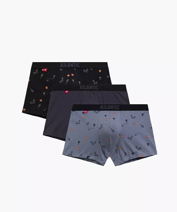 Bokserki męskie- wysokiej jakości wzorzysta bawełna- sportowy charakter bielizny- w pasie szeroka guma z napisem ATLANTIC- idealne dopasowanie do ciała- pakowane w pudełko po trzy sztuki prečítať celé
