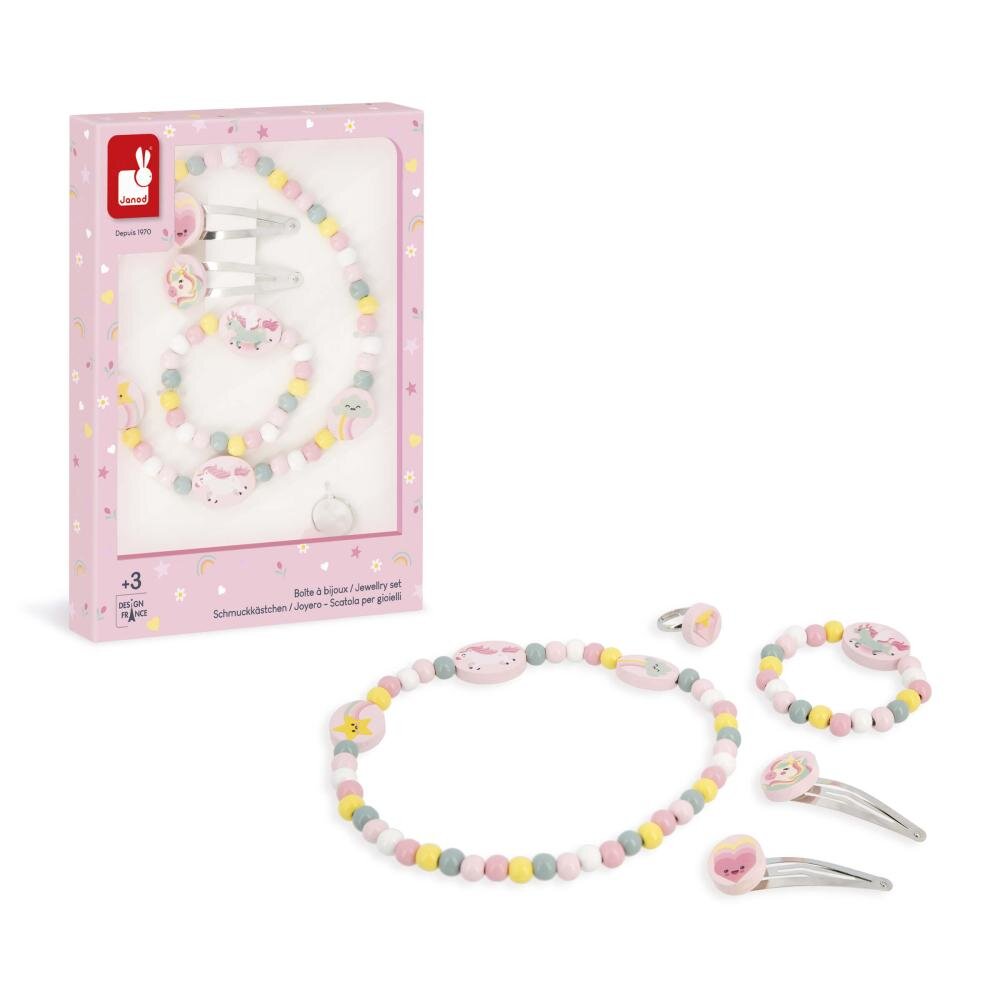 Dodajte detskému outfitu šmrnc! Táto súprava šperkov s jednorožcom je vhodná pre deti od 3 rokov. Obsahuje náhrdelník, náramok, prsteň a dve spony, všetko s báječným motívom jednorožca! 5 drevených šperkov, ktoré sa hodia k vášmu účesu. Táto súprava šperkov, ktorá je ideálna pre fanúšikov...
