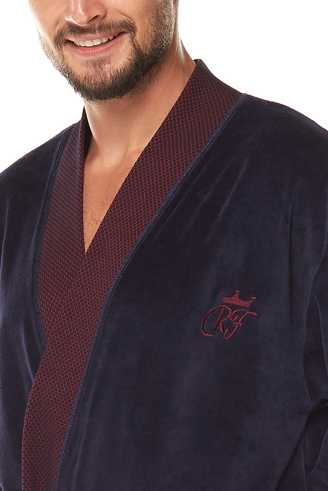 Welurowy szlafrok męski- długi, z szalowym kołnierzem, wiązany w pasie- na wysokości bioder dwie kieszenie- mankiety, kołnierz i kieszenie wykończone wzorzystą dzianiną- na wysokości klatki piersiowej mała aplikacja prečítať celé