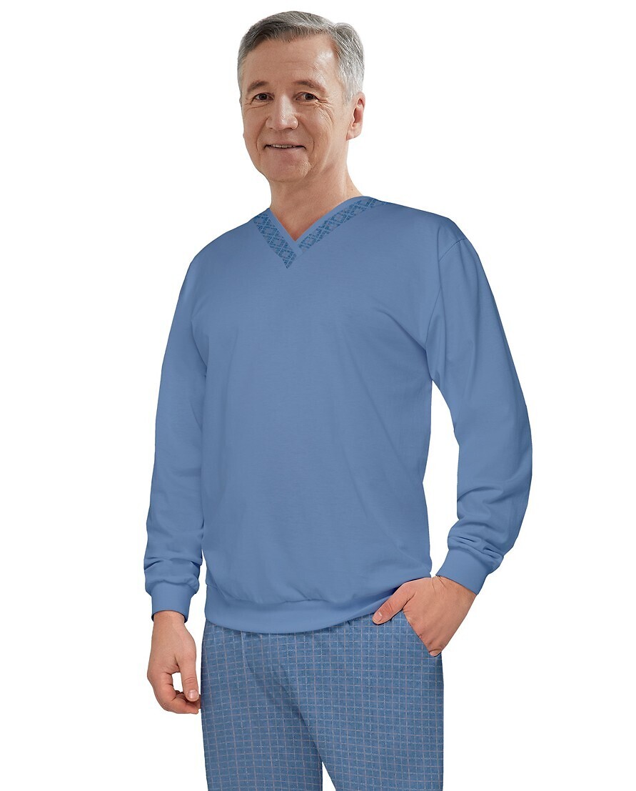 Piżama męska- wysokiej jakości bawełna- bluza jednolita z długim rękawem- wzorzysty dekolt w szpic- na biodrach wygodne kieszenie- nogawki zakończone ściągaczem prečítať celé