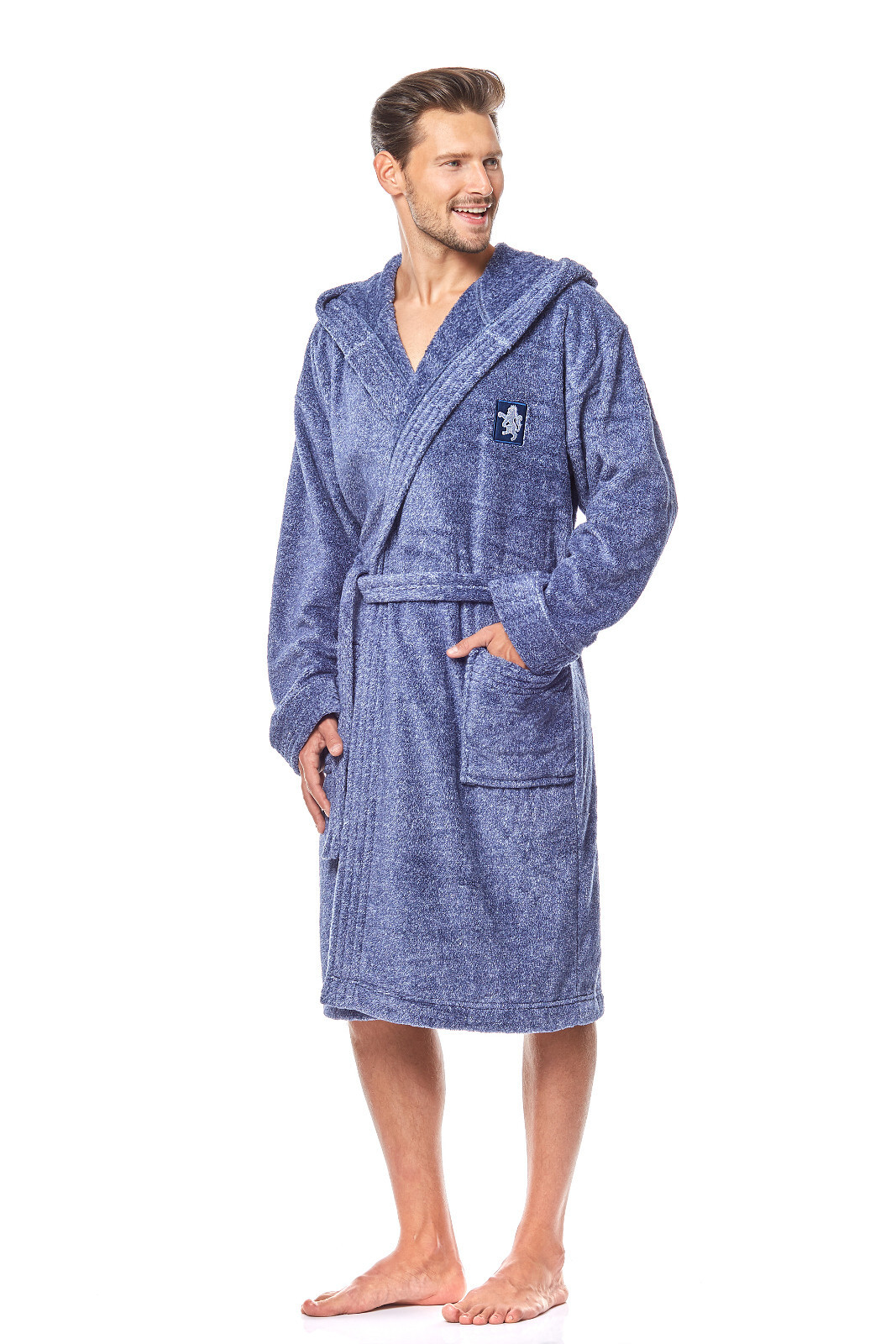 Długi szlafrok męski- z kapturem, wiązany w pasie, z miękkiej dzianiny (soft)- na biodrach kieszenie zewnętrzne- na wysokości klatki piersiowej naszyta aplikacja- miły i przyjemny w dotyku- gwarantuje komfort noszenia prečítať celé