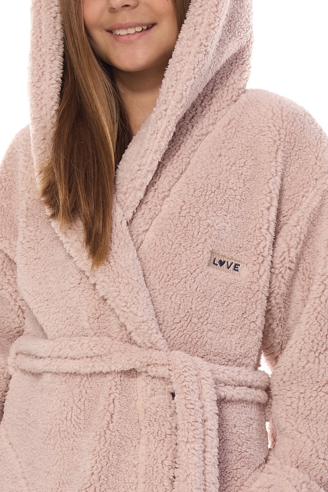 Szlafrok dziewczęcy z kapturem- miły materiał typu soft- na piersi ozdobna aplikacja z napisem LOVE- wiązany w pasie- na wysokości bioder wygodne kieszenie prečítať celé