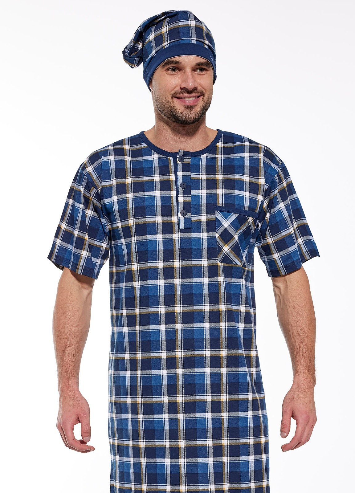 Koszula nocna, męska- wykonana z bawełny w kratkę- z krótkim rękawem- dekolt półokrągły, zapinana na trzy guziczki- na piersi naszyta kieszonka- do kompletu szlafmyca prečítať celé