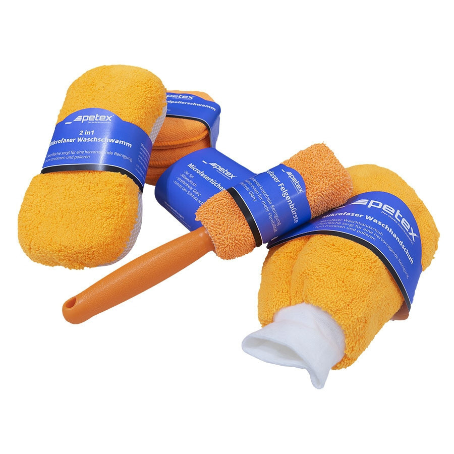 Obsah sady: 1x rukavice z mikrovlákna (cca 22x18cm) 1x čisticí houbička 2v1 (s mřížkovou tkaninou a látkou z mikrovlákna, 22x11cm) 3x lešticí polštářek (průměr 11,5cm) 3x utěrky z mikrovlákna 1x kartáč z mikrovlákna (celková déla 27,5cm, průměr hlavy kartáče 5cm)Sada je uložená v praktické tašce.
