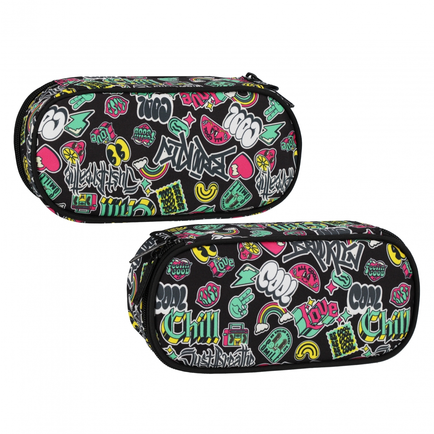 Zalety produktu: odporny materiał, podszewka, która chroni przed zabrudzeniem i jest łatwa w czyszczeniu, mocny zamek błyskawiczny, bardzo pojemny, kształt saszetki. Piórnik Cool w kolorze czarnym z kolorową grafiką w kształcie saszetki z dużym zamkiem błyskawicznym. Pomieści niezbędne artykuły...