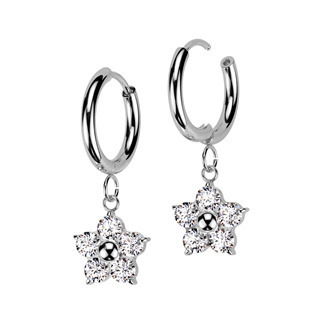 Ocelové náušnice kroužky se zavěšenými kytičkymi zdobenými čirými zirkony