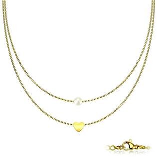 Dvojitý dámský ocelový náhrdelník dekorovaný srdíčkem a syntetickou perličkou