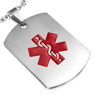 Ocelový přívěšek - zdravotní destička hvězda života (Had a Aeskulapova hůl)Na zadní stranu destičky lze vyrýt důležité informace týkající se zdravotního stavu např: - jsem epileptik- mám cukrovku- jsem epileptik- jsem kardiak- krevní skupinu- telefonní číslo- adresu bydlištěOcelový přívěšek je...