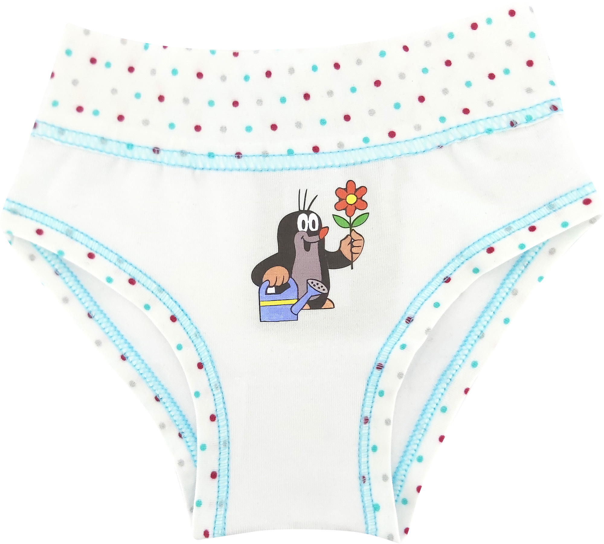 Dívčí kalhotky s Krtečkem KR 006 z kolekce Boma® pro malé slečny. Elastický bavlněný úplet je pružný, vyšší podíl bavlny zaručuje pohodlné nošení během celého dne. Lemy nohaviček a v pase jsou z puntíkatého úpletu bez škrtících gumiček, sešité plochými švy pro maximální pohodlí. Dětské kalhotky mají potisk s obrázkem oblíbeného Krtka, na každodenní nošení jak dělané.