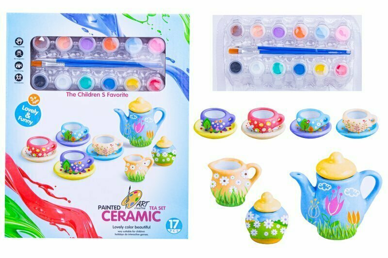 Ceramiczny zestaw (17 elementów) do ozdabiania. Zestaw składa się z filiżanek, spodeczków oraz czajniczka idealnie nadaje się kreatywnej zabawy. W zestawie znajdują się dwa pędzelki i komplet dwunastu farb.Wymiary opakowania: 29x26x4cm.Wiek: 3+. prečítať celé
