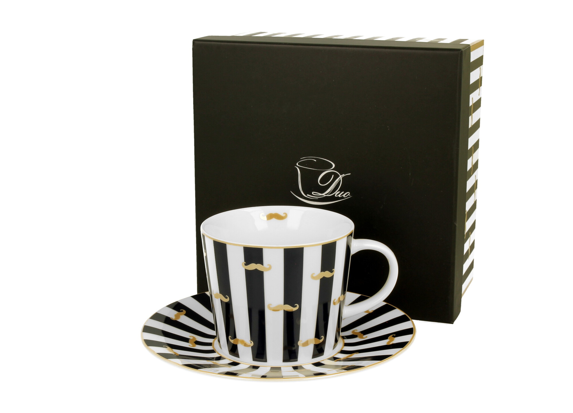 Filiżanka ze spodkiem Granatowa - WĄSY wchodzący w skład serii SERCA, wykonana z porcelany New Bone China, charakteryzującej się elegancką i naturalną kremowo - białą barwą z delikatnym połyskiem, a także wyjątkową wytrzymałością.Filiżanka zdobiona wzorem złotych wąsów na tle granatowo - białych...