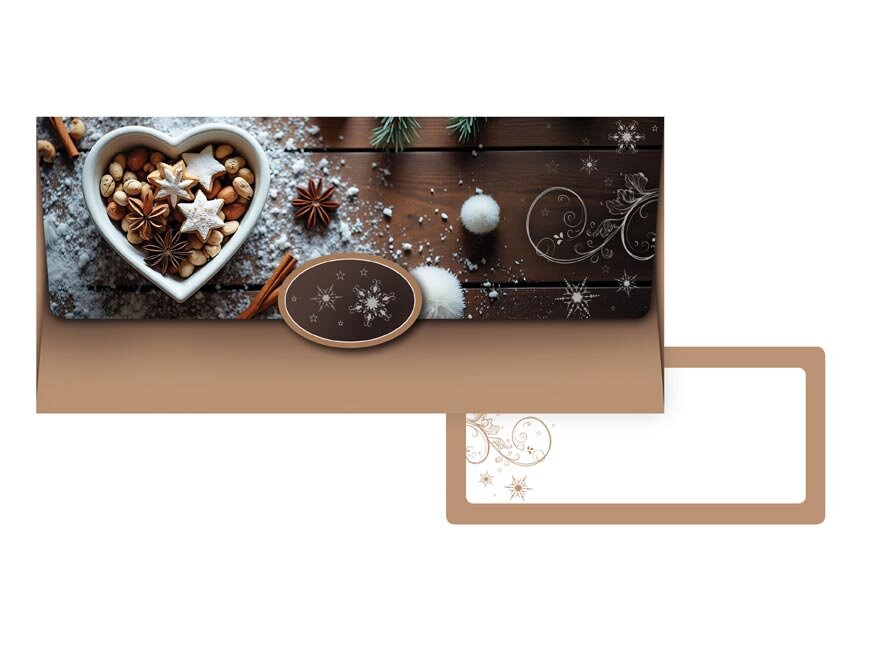 Tato půvabná vánoční obálka na peníze promění váš finanční dárek v nezapomenutelný zážitek. Na dřevěném pozadí se snoubí kouzlo Vánoc – srdcová miska plná oříšků, voňavého koření a hvězdiček z perníku, které evokují domácí pohodu a radostné chvíle. Jemné sněhové vločky a ornamenty dodávají obálce slavnostní eleganci a přenášejí kouzelnou atmosféru svátečních dní.