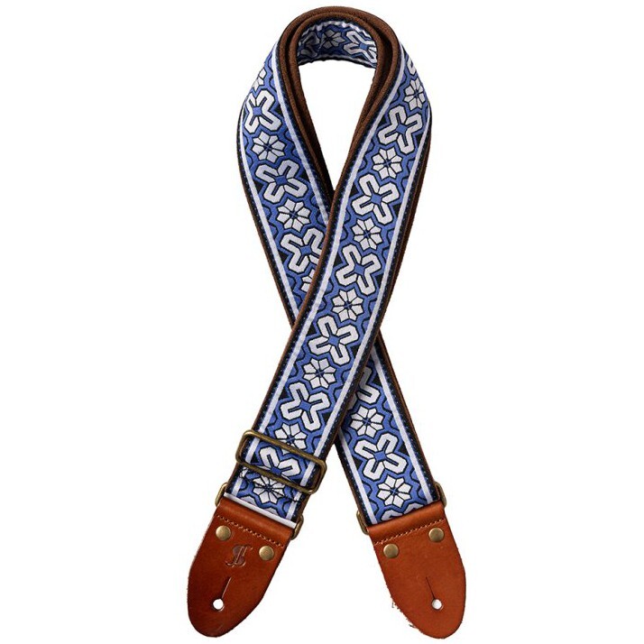 Tkaný nylonový kytarový popruh, vzor tiare, kožené konce. Barva modrá.Materiál: tkaný nylonBarva: modrá prečítať celé