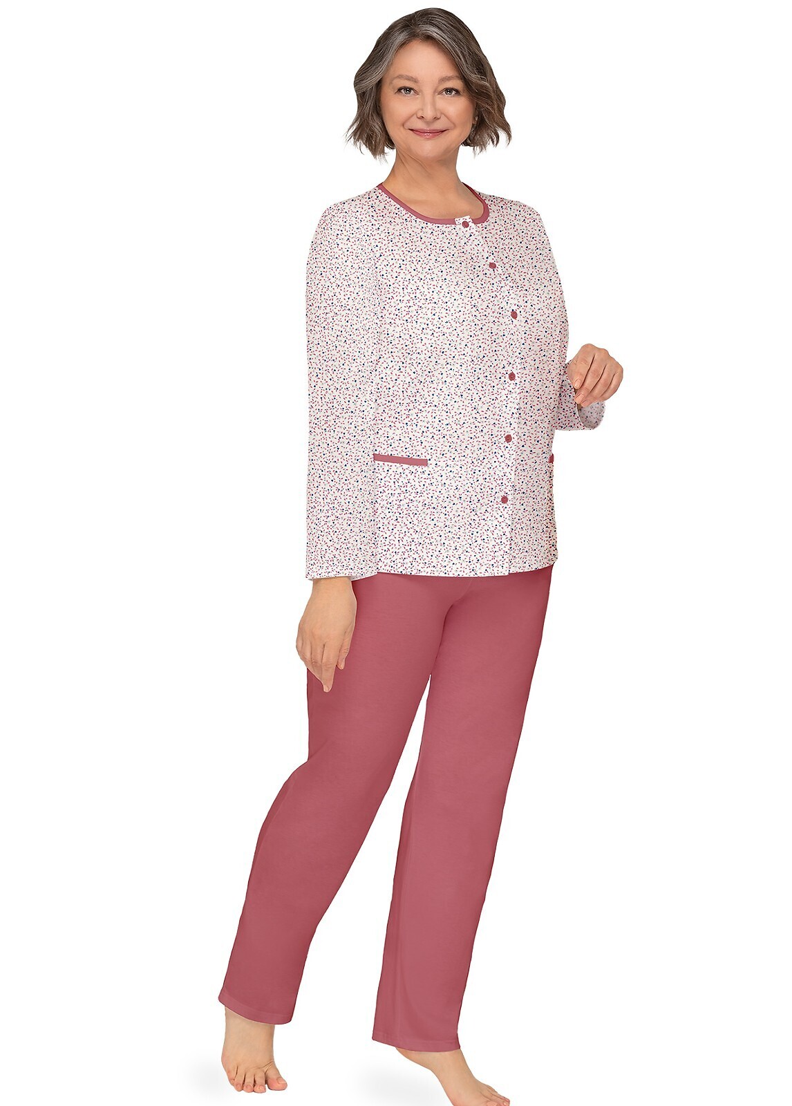 Piżama damska- wykonana z delikatnej bawełny- koszulka wzorzysta, zapinana na guziki- długi rękaw- po bokach naszyte kieszenie- spodnie długie, jednolite Skład: 100% bawełna prečítať celé