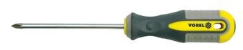 Křížový šroubovák PH1 x 100 mm. Vyrobeno z chrom-vanadiové CrV oceli. Špička má saténový povrch, dodatečně pískovaná a magnetizovaná, což umožňuje pevné uchopení hlavy šroubu. Rukojeť je vyrobena ze dvou kompozitního plastu. Otvor v rukojeti umožňuje zavěsit šroubovák.