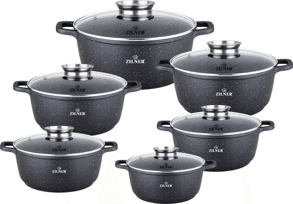 Sada hrnců s černým keramicko-mramorovým povrchem a poklicemi, 12 dílná