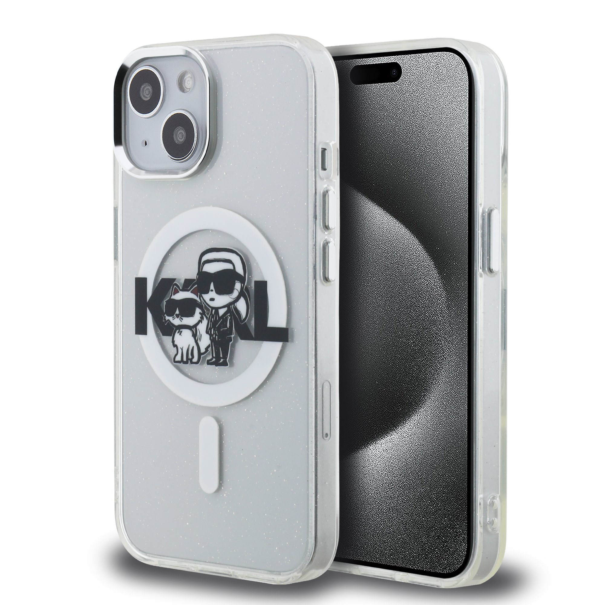 Karl Lagerfeld IML Glitter Karl and Choupette Sketch MagSafe Zadní Kryt pro iPhone 15 Transparent
