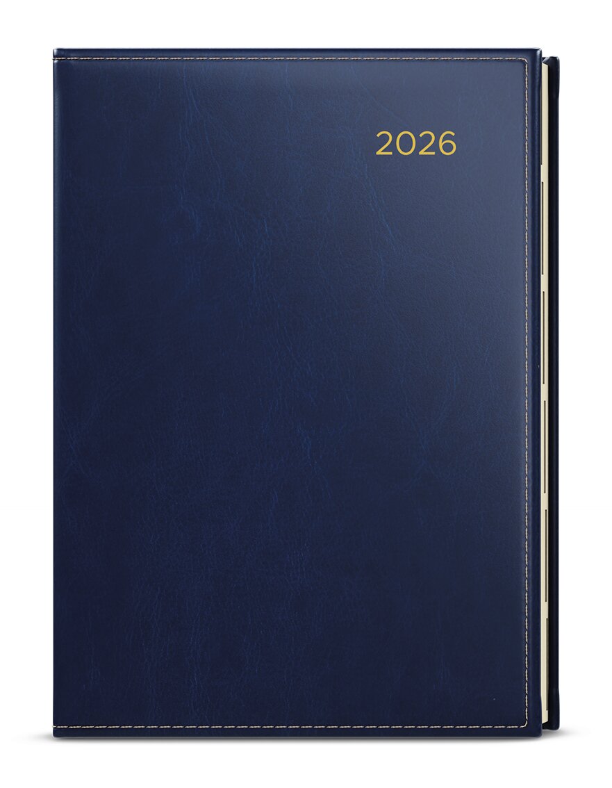 Týdenní diář vyrobený z modré koženky s moderní zlatou ražbou roku. Diář, který povýší jakoukoli Vaši schůzku. jemný hladký materiál s lesklým povrchem, ražba roku, obšití v béžové barvě, jednostranná pěnová výplň desek, šitá vazba V8, kapitálky, stužka, perforované rožky, ofset, 70g/m2, krémový papír