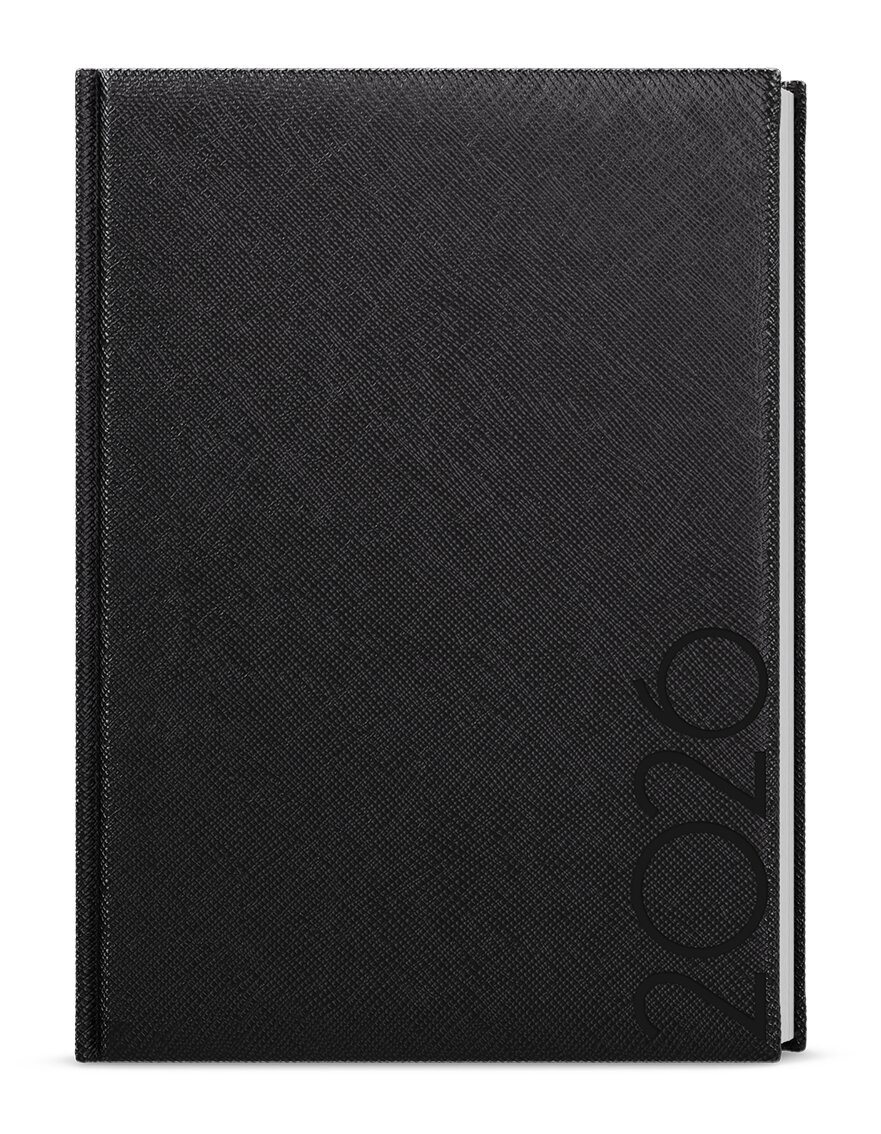 Neobyčejný denní diář s lesklým povrchem ze strukturovaného materiálu v černé barvě je vyráběný ve formátu A5 a má velký prostor pro poznámky a plánování. strukturovaný materiál s lesklým povrchem, ražba roku, jednostranná pěnová výplň desek, šitá vazba V8, stužka, kapitálky, perforované rožky,...