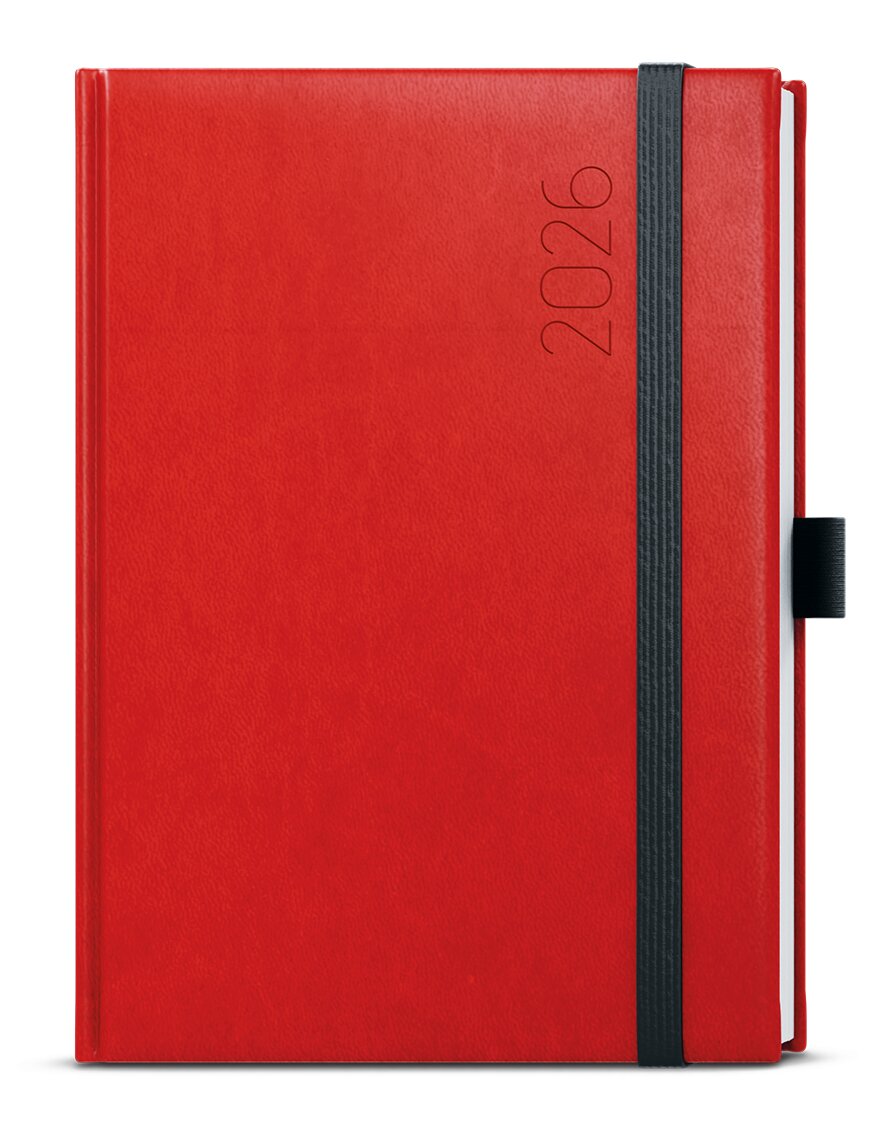 Týdenní diář v červené barvě z jemné vivelly ve formátu A5 s praktickou gumičkou a poutkem na propisku. Má velký prostor pro poznámky a plánování. jemný hladký materiál, ražba roku, jednostranná pěnová výplň desek, šitá vazba V8, stužka, kapitálky, perforované rožky, mapa ČR a SR, vlepená kapsa,...