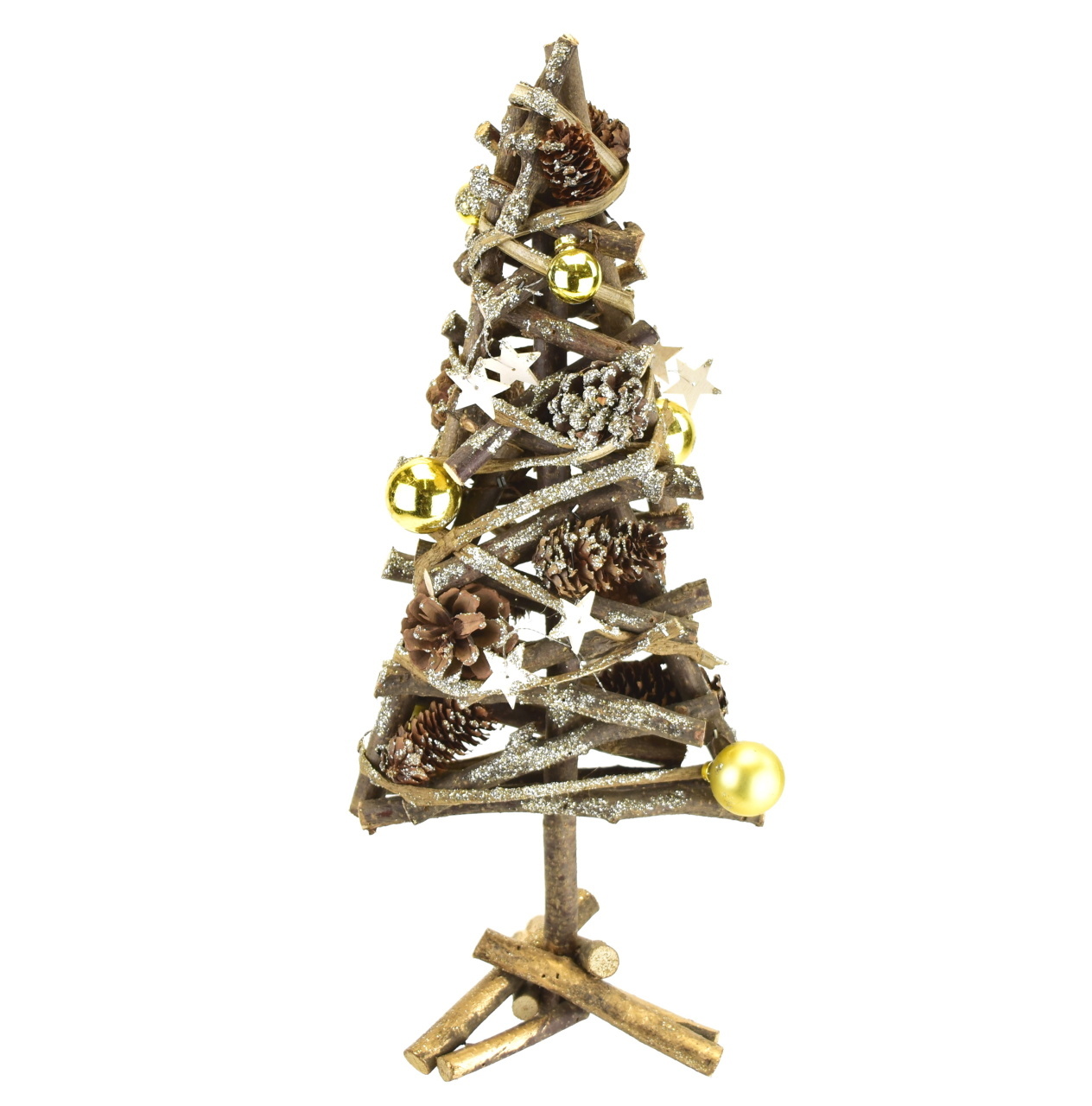 Ozdoben zlatými kouličkami, šiškami a dřevěnými hvězdičkami pro elegantní vzhled