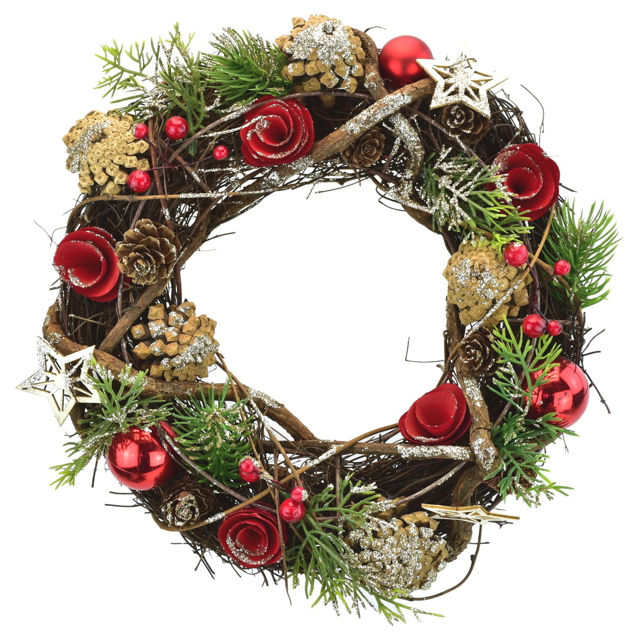 Chcete si vyzdobit svůj domov vánoční atmosférou? Pak máme pro vás ten správný kousek! Naše přírodní věnec s červenými kvítky je vyroben z proutí a zdoben dřevěnými kvítky, hvězdičkami, bezinkami, šiškami, ratanem a větvičkami. A abychom jeho krásu ještě umocnili, všechno je lehce posypáno...