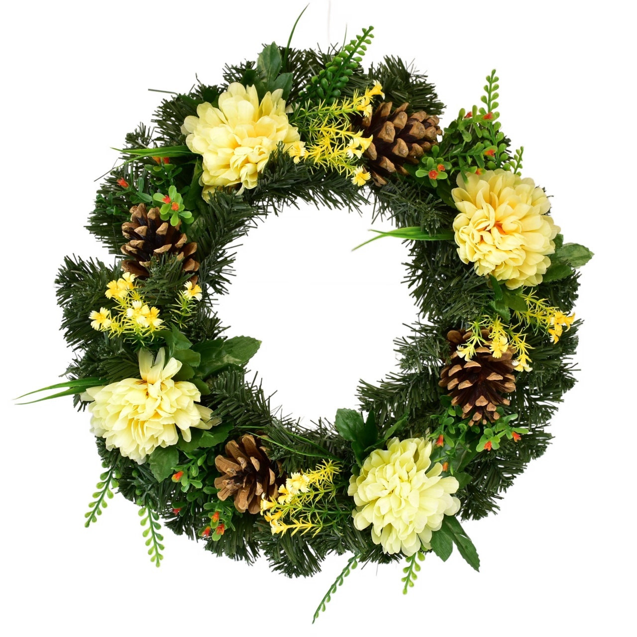 Podzimní věnec se světle žlutými chryzantémami je dokonalou výzdobou na podzimní období. Tento věnec je vyroben z umělého zeleného jehličí a je zdoben čtyřmi květy světle žlutých chryzantém, které doplňují zelené listy, šišky a zelené větvičky s drobnými kvítky. Jeho vnější průměr činí 35...