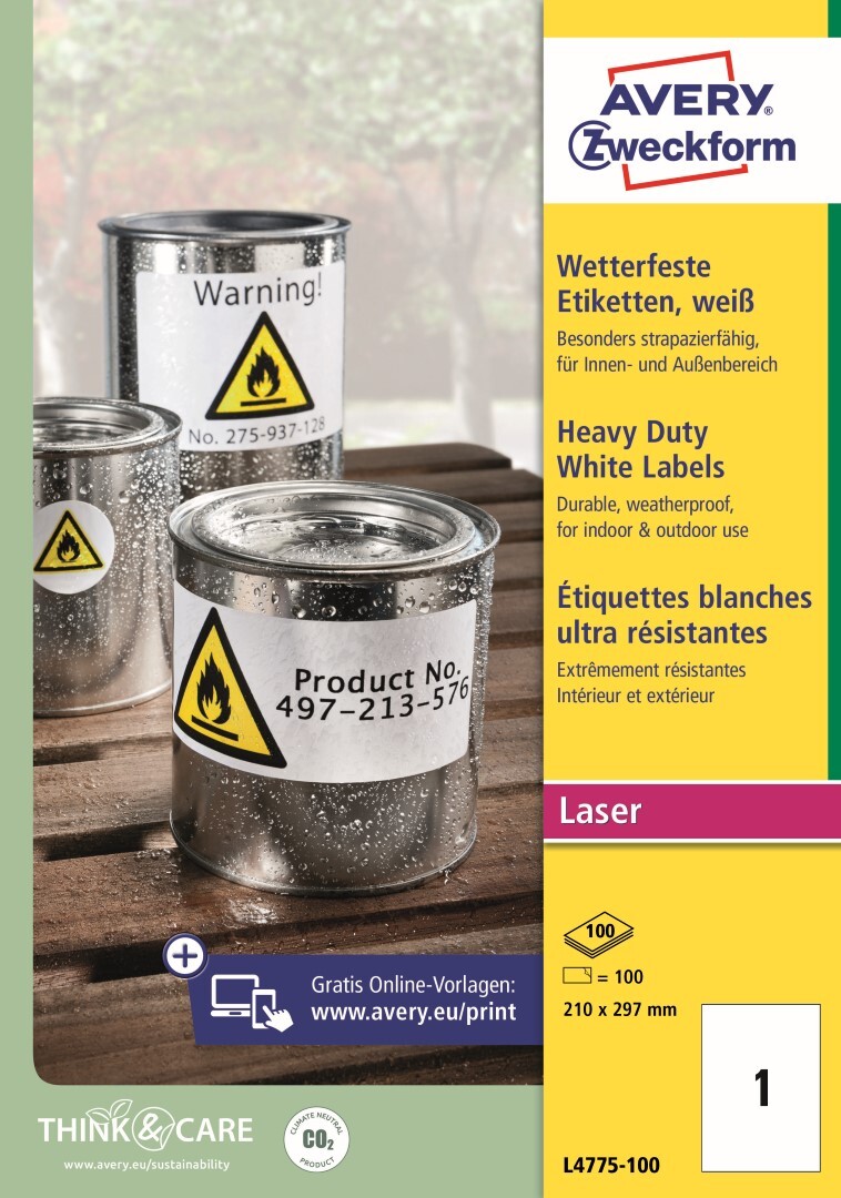 Avery Zweckform L4775-100 Odolné etikety A4, 100 ks, 100 archů A4, bílé, PET