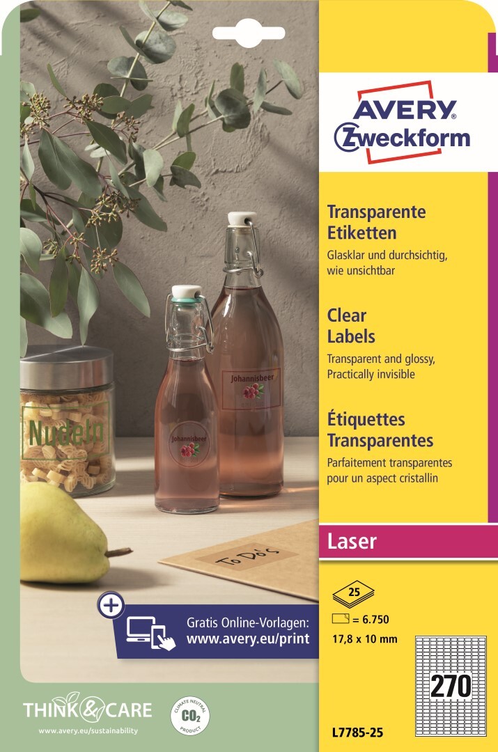 Avery Zweckform L7785-25 Čiré etikety 17,8 × 10 mm, 6 750 ks, 25 archů A4, lesklá PET fólie