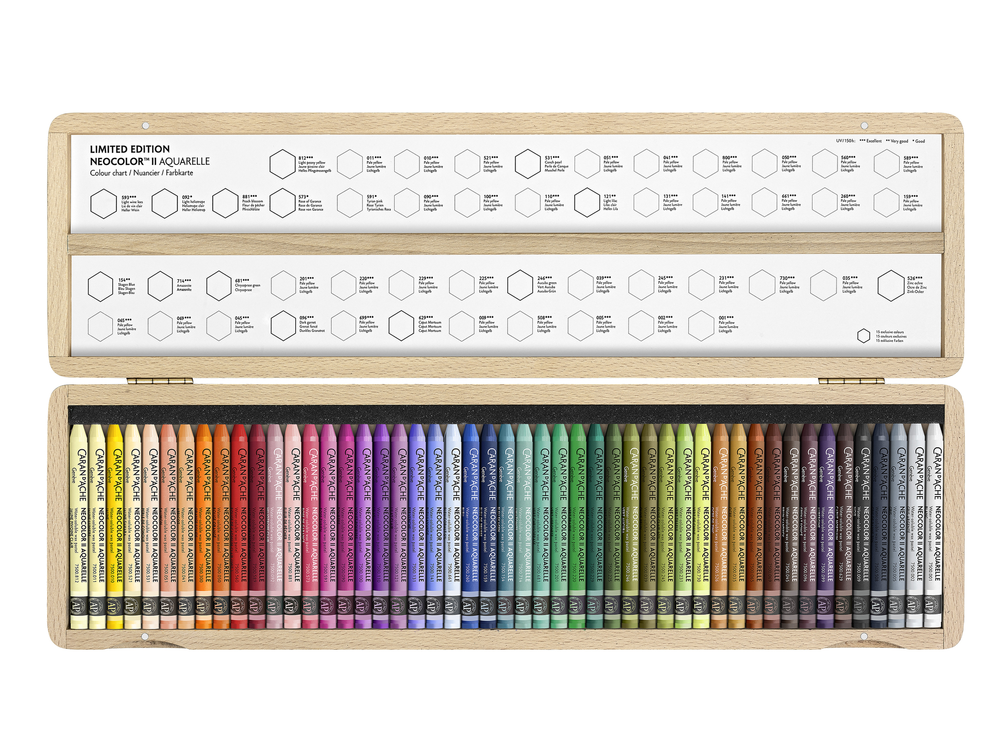 Dřevěná krabička obsahující 50 pastelek Neocolor™ II Aquarelle Vlastnosti produktu: Jasné a krycí barvy Jedinečný sortiment Vyvážená barevná paleta 50 barev, včetně 35barev ze stávající řady 84 Neocolor II Aquarelle a15 exkluzivních barev vyvinutých speciálně pro toto výročí Prázdná barevná...