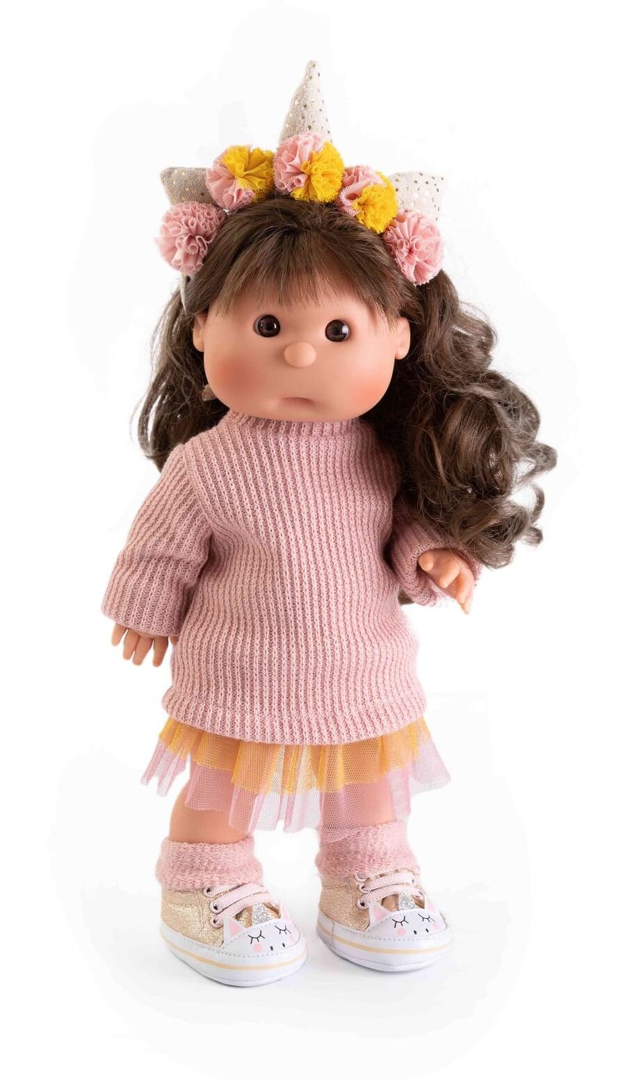 Ručně vyrobená španělská imaginární panenka s celovinylovým tělem a vlásky po celé hlavě. Oblečení některých panenek bylo vyrobeno z organické bavlny, která zaručuje výrobu z ručně sbírané, ekologicky bez chemického ošetření pěstované bavlny. Firma Antonio Juan klade velký důraz na ekologii a proto jako první využívá v tomto odvětví zmíněnou bavlnu. Velikost 38 cm. Baleno v dárkové krabici. Doporučený věk od 3 let.
