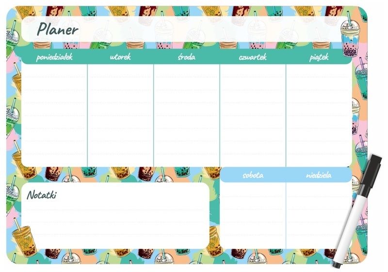 Planer magnetyczny 35x25 tygodniowy bubble tea + marker kod: PM-02-37 - planer na lodówkę z motywem z Kolekcji nadruków - wyposażony w magnetyczny podkład, dzięki któremu można umieścić go na lodówce, jak i każdej innej powierzchni metalowej - układ tygodniowy znacznie ułatwi zaplanowanie...
