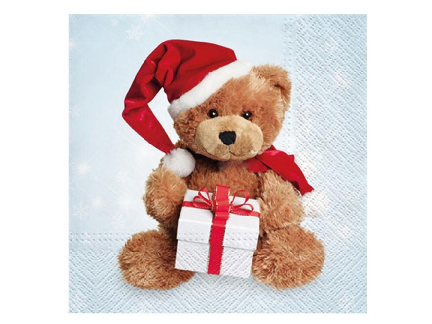 Vánoční ubrousek s medvídkem a dárkemRoztomilý motiv plyšového medvídka v červené čepici a šále s bílým dárkem v rukou vnese na váš stůl hravou a radostnou atmosféru Vánoc. Ideální volba pro sváteční stolování s dětmi, rodinné oslavy nebo zimní posezení s přáteli.Ubrousek je třívrstvý a uplatní...