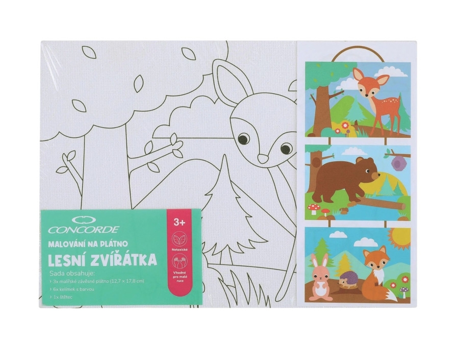 Malování na plátno s motivy lesních zvírátek. Sada obsahuje 3 malírská závesná plátna o rozmeru 12,7 × 17,8 cm, 6 kelímku s barvou a štetec. Obrázky lze vymalovat podle predlohy nebo popustit uzdu své fantazii a vytvorit vlastní originální díla. Tvorení prináší radost, uvolnení a podporuje tvurcí schopnosti.
