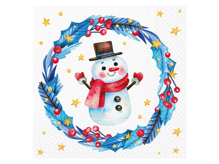 Vánoční ubrousek se sněhulákemVeselý sněhulák v červené šále a klobouku vykouzlí úsměv na tváři každého hosta a promění prostřený stůl v hravé zimní království. Motiv doplňuje barevný věnec z modrých lístků, červených bobulek a zlatých hvězdiček, který dodává ubrousku slavnostní a pohádkový...