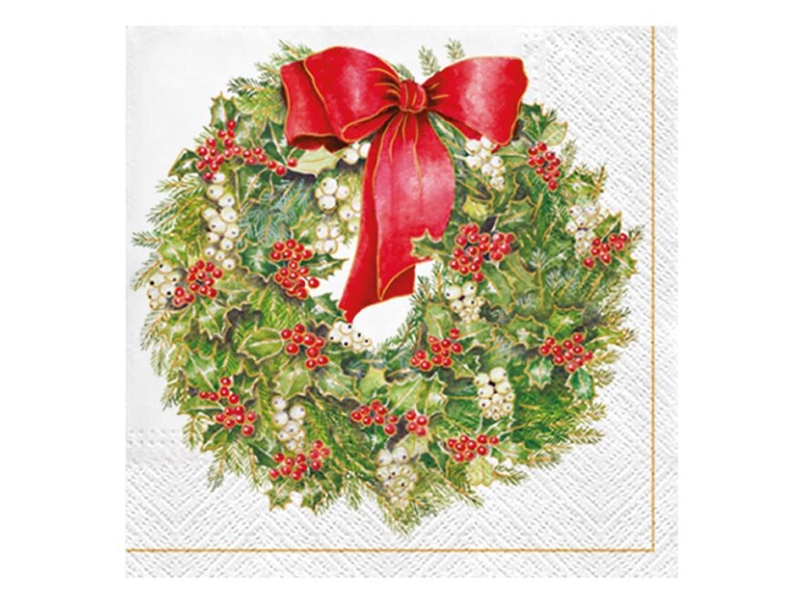 Vánoční ubrousek s motivem věnce Tradiční vánoční ubrousek s věncem spleteným z jehličí a cesmíny, ozdobený červenými bobulemi, bílými plody a výraznou červenou mašlí. Tento klasický motiv v sytých barvách vnese na váš stůl tu pravou sváteční náladu.Ubrousek je třívrstvý, pevný a praktický, takže...