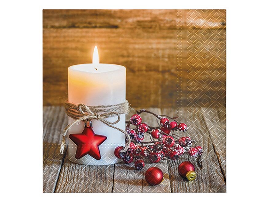 Vánoční ubrousek s rustikálním motivem svíčkyTento ubrousek vnese na váš stůl klidnou zimní atmosféru – decentní plamen svíčky, přírodní jutový provázek a červené akcenty vytvářejí harmonický celek, který zaujme na první pohled. Jemný rustikální motiv krásně ladí se sváteční tabulí a doplní i...