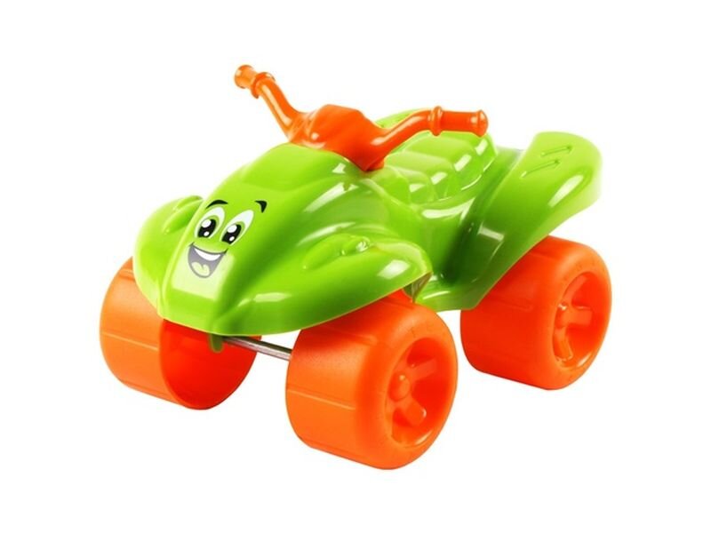Zabawka wykonana jest z lekkiego i trwałego plastiku, co czyni ją bezpieczną i łatwą do przenoszenia przez dzieci. Quad ma intensywny zielony kolor, a jego duże, pomarańczowe koła dodają mu charakterystycznego wyglądu i sprawiają, że pojazd łatwo porusza się po różnych powierzchniach.Z przodu...