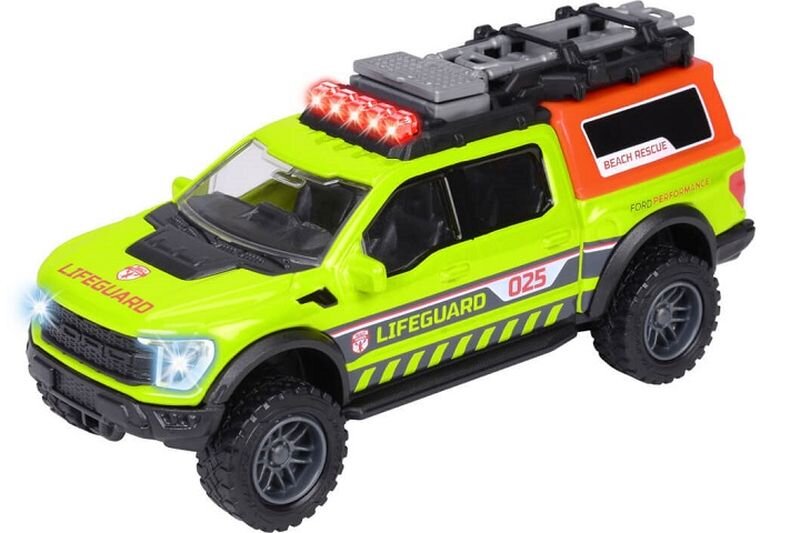 Zestaw Majorette Ford F-150 Raptor Lifeguard to zabawka przedstawiająca ratowniczy pojazd terenowy, wzorowany na popularnym modelu Forda.