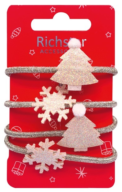 Gumičky do vlasů vánoční s glitry, 4 ks Třpytivé vánoční gumičky rozzáří každý účes svátečním leskem. Roztomilé motivy doplněné glitrovým zdobením jsou ideální pro slavnostní atmosféru i hravý styl. Využití: Skvělé na vánoční besídky, focení, oslavy nebo jako drobný dárek do adventního...