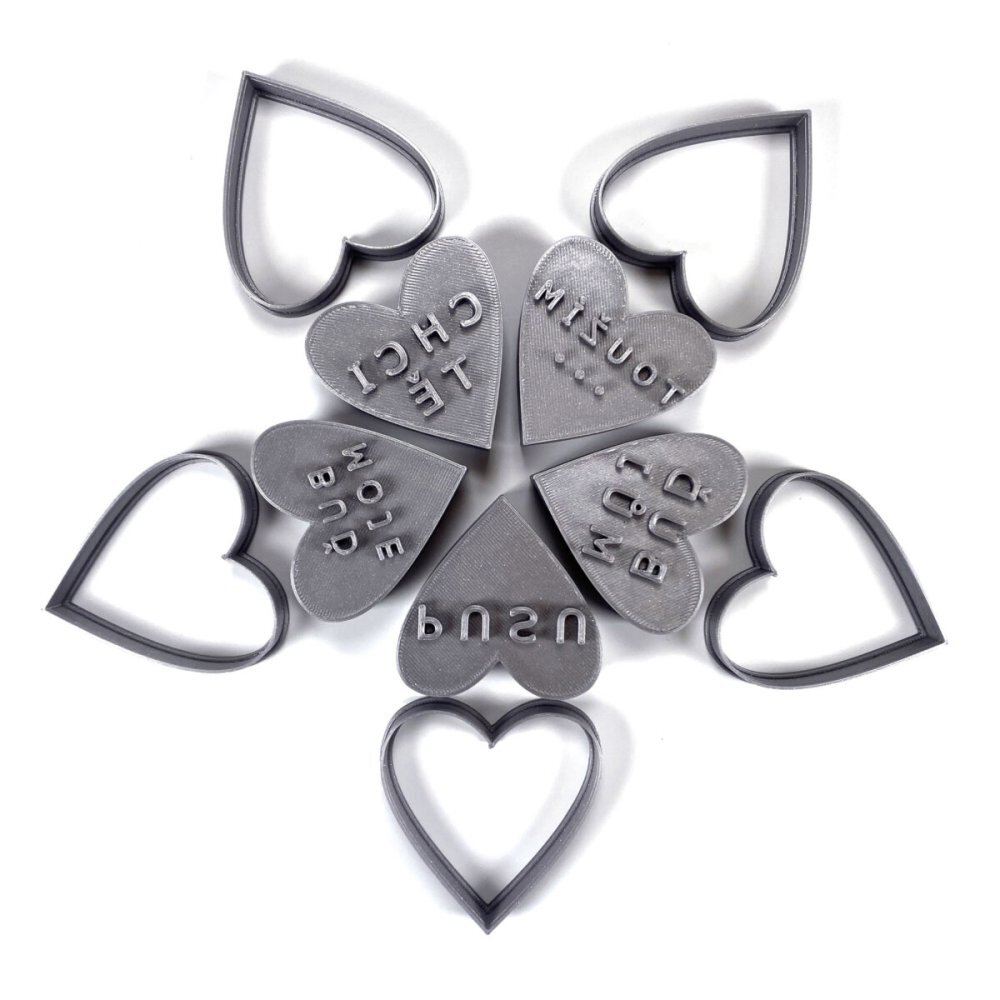 Plastová razítka vyrábíme inovativním 3D tiskem, z plastového materiálu PLA (materiál biologicky odbouratelný), odolný do 50°C a nevhodný do myčky na nádobí. Tvořítka jsou složena ze dvou částí: ostré obvodové srdce vykrojí těsto a razítko s textem detailně přenese konkrétní motiv do hmoty. Mezi...