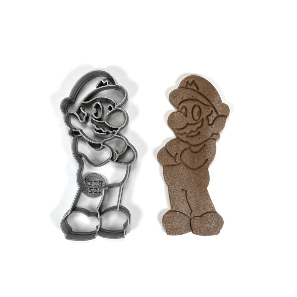 Inovativní technologií 3D tisku bylo navrženo a zhotoveno vykrajovátko panáčka s montérkami. Použit byl plastový materiál PLA (biologicky odbouratelný), odolný do 50°C, nevhodný do myčky na nádobí. Díky otisku středních linií do těsta bude italský mužík a jeho charakteristické „M“ na kšiltovce...