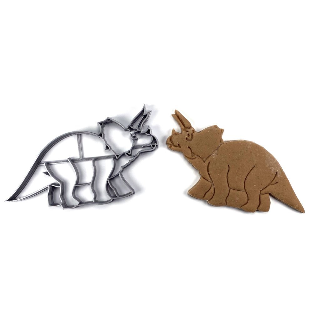 Oblíbené vykrajovátko všem známého dinosauřího rohatého tvora. Toto vykrajovátko je vyrobeno na 3D tiskárně, z materiálu PLA plast (materiál biologicky odbouratelný), odolný do 50°C, nevhodný do myčky na nádobí. Za pomoci středu se do hmoty otisknou střední linie, pomocí kterých lze snadno zdobit...